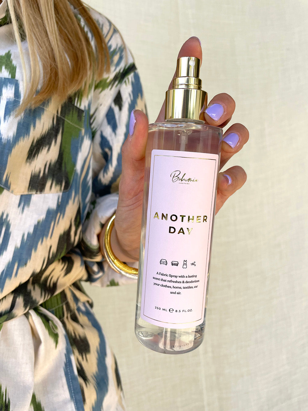Welcome to a new way to care for your clothes and spaces with Another Day Fabric Spray by Bohemia Couture. Totally genderless, this fabric spray offers a clean beautiful scent that effortlessly refreshes and deodorizes everything from your favorite garments to home textiles, car interiors, and even the air around you. Perfect for extending the life of your clothes by giving them "Another Day" before the next wash.