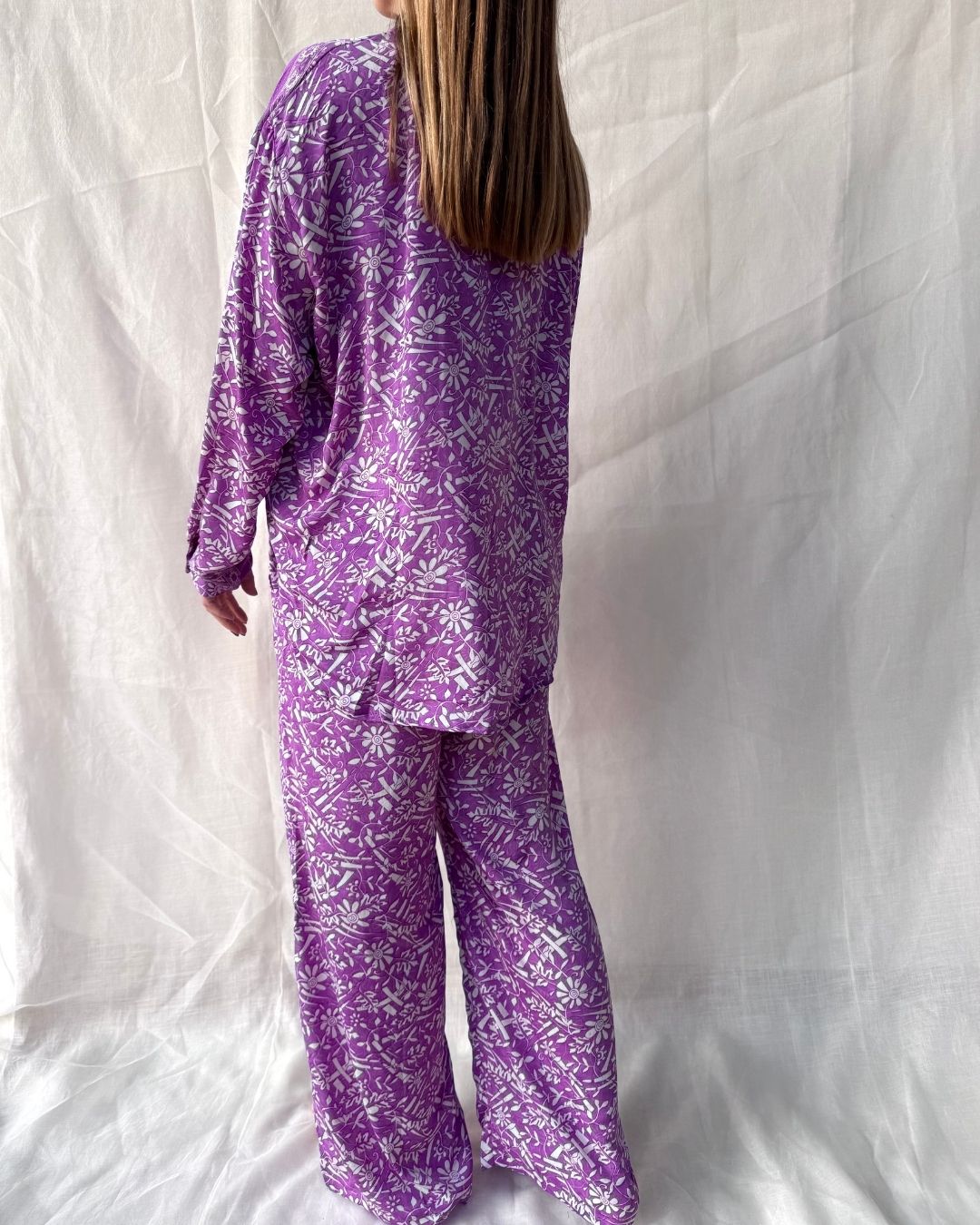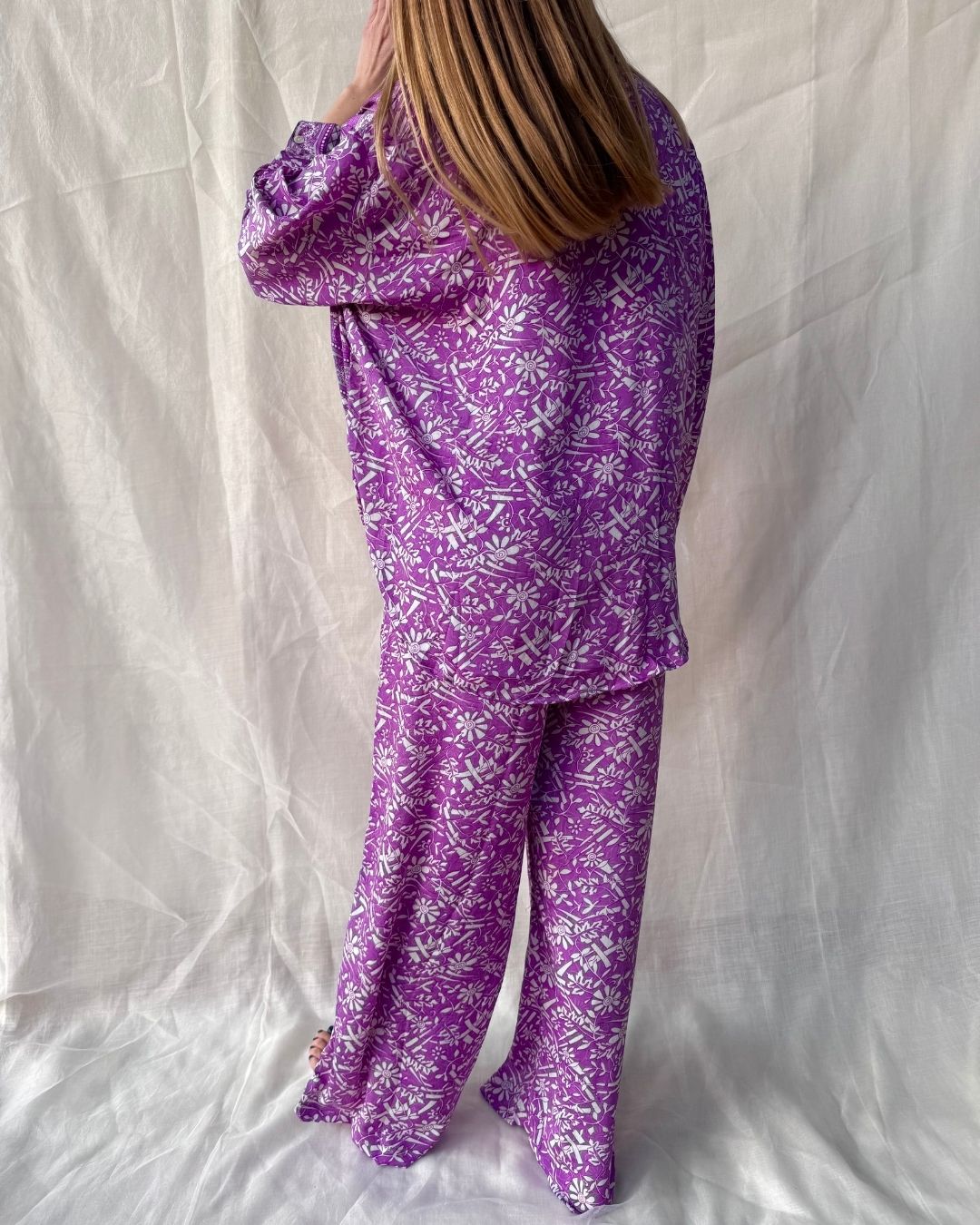 The shirt is adorned with shell buttons and the pants have a soft elastic and 2 invisible pockets.