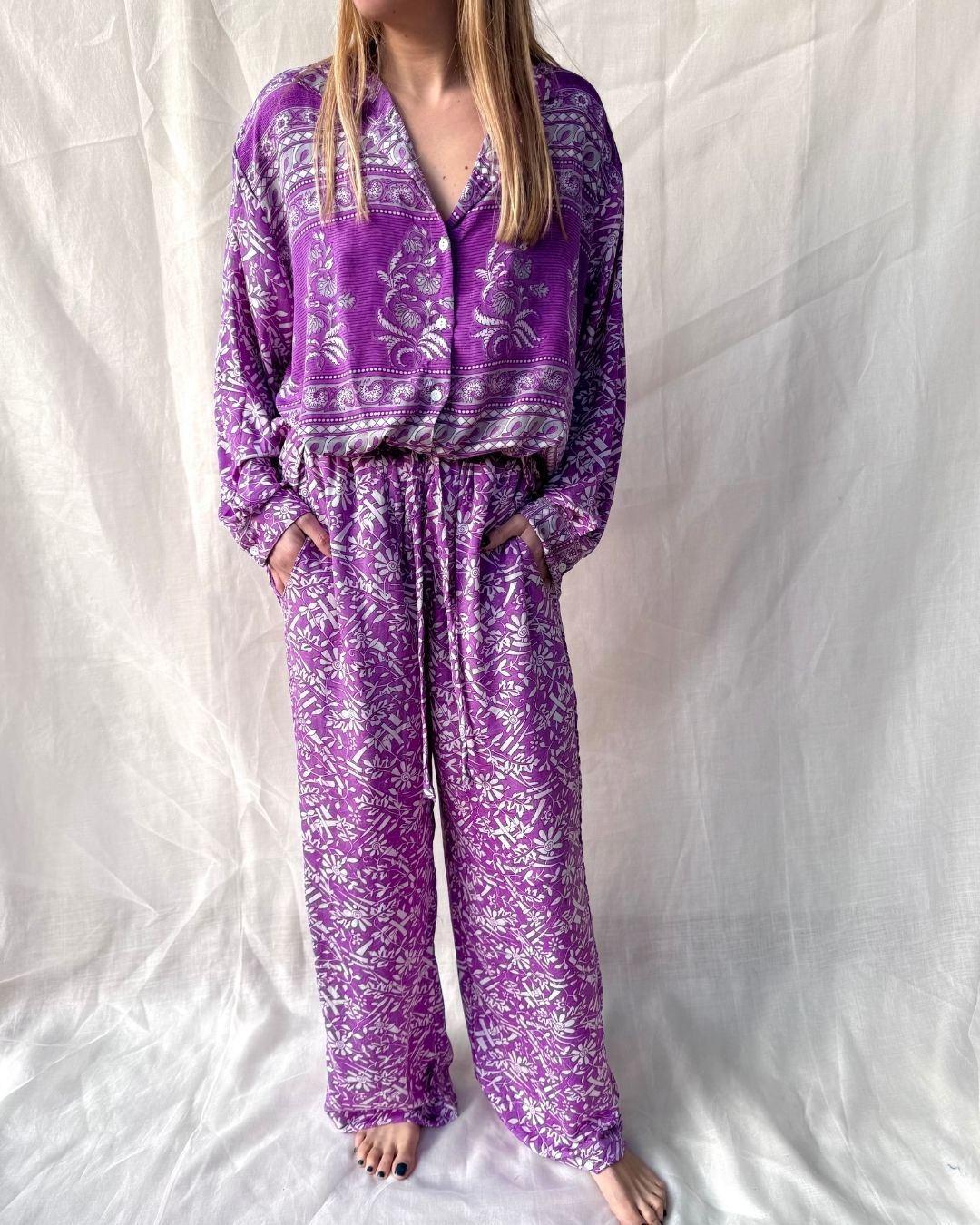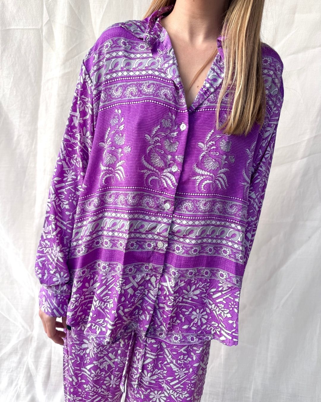 Elevate your wardrobe with this exquisite shirt and pant set made from upcycled vintage Indian sarees. The flowing design and unique patterns make each piece one-of-a-kind, adding a touch of chic sophistication to your style.