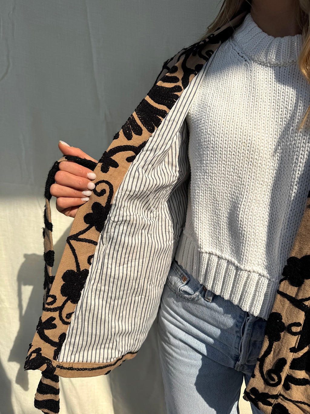 An eye-catching embroidery is placed all over this vest and it comes with 2 side pockets, matching belt and it has a soft inner lining, perfect for midseason weather and great for winter with a warm sweater underneath.