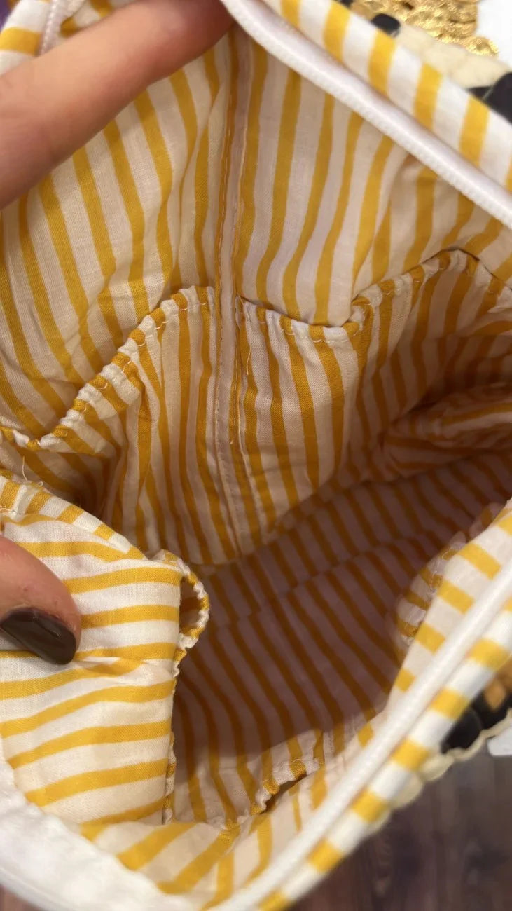 Our Mini Cosmetic Bag is your new go-to for keeping essentials organised, whether at home or on the move. As a sustainable bestseller, this bag is crafted from 100% hand-printed cotton and features a cotton inner lining, making it perfect for storing cosmetics or small items. Its compact design includes handy inner pockets for optimal organisation, combining charm with practicality.